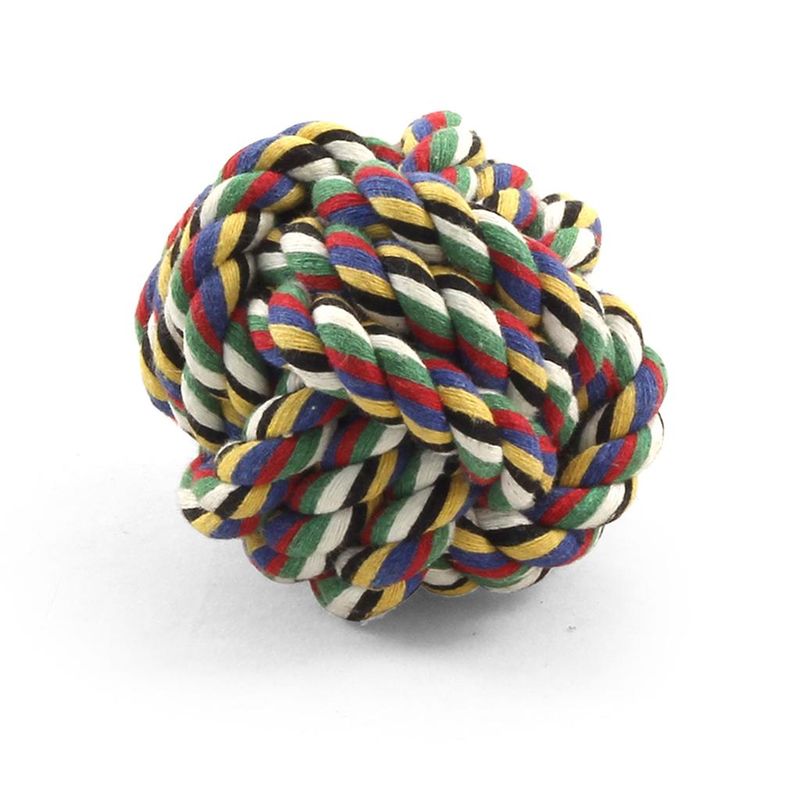 Плетеный мяч сделан из разноцветных веревок из натурального хлопка, очень прочный. Способствует тренировке жевательных мышц у собаки. Цвет: разноцветный. Размер d50мм.