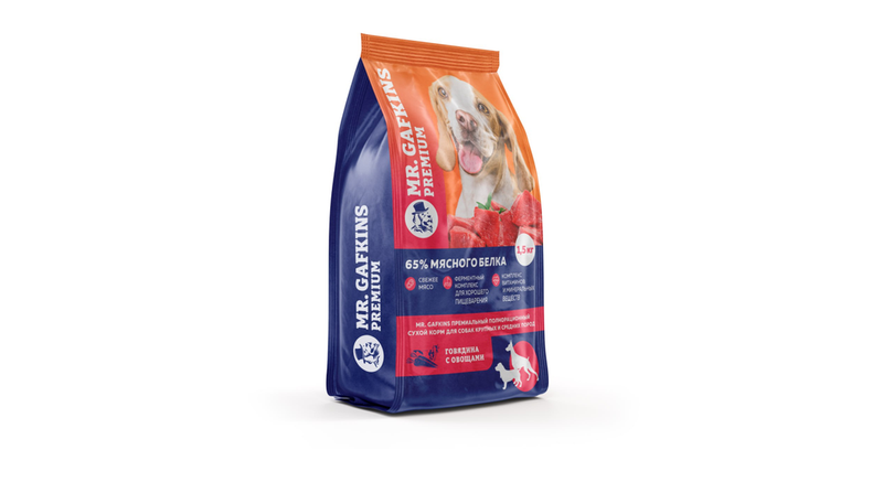 ГлавнаяКаталогКорм для собак → Mr.Gafkins, Премиальный сухой корм для собак крупных и средних пород "Говядина с овощами"